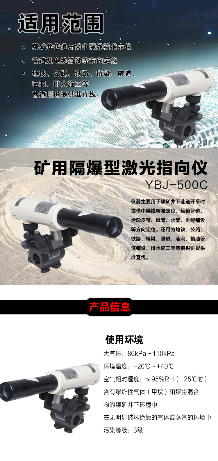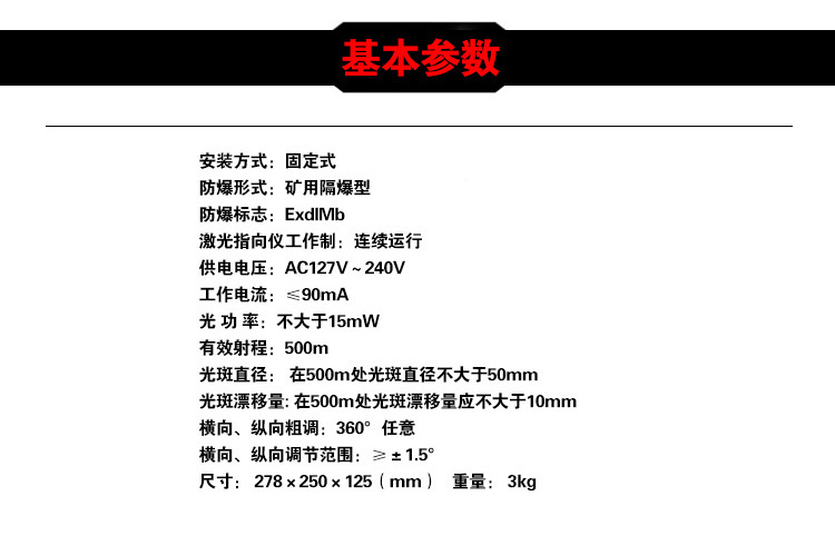 YBJ矿用隔爆型激光指向仪是集电子、光学、精密机械等技术为一体的仪器。具有外形美观、体积小、重量轻、防爆等特点。仪器安装采用固定式,通过悬挂组可快速固定在锚杆上。仪器可在360°范围任意粗调,微调准确;调节方便,制动可靠。产品采用自主研发的光学系统,可采用红、绿两种光源,光斑大小、射程满足矿下施工需求。仪器采用交直流转换电源模块,交流宽电压AC80V~AC245V供电,具有保护功能。